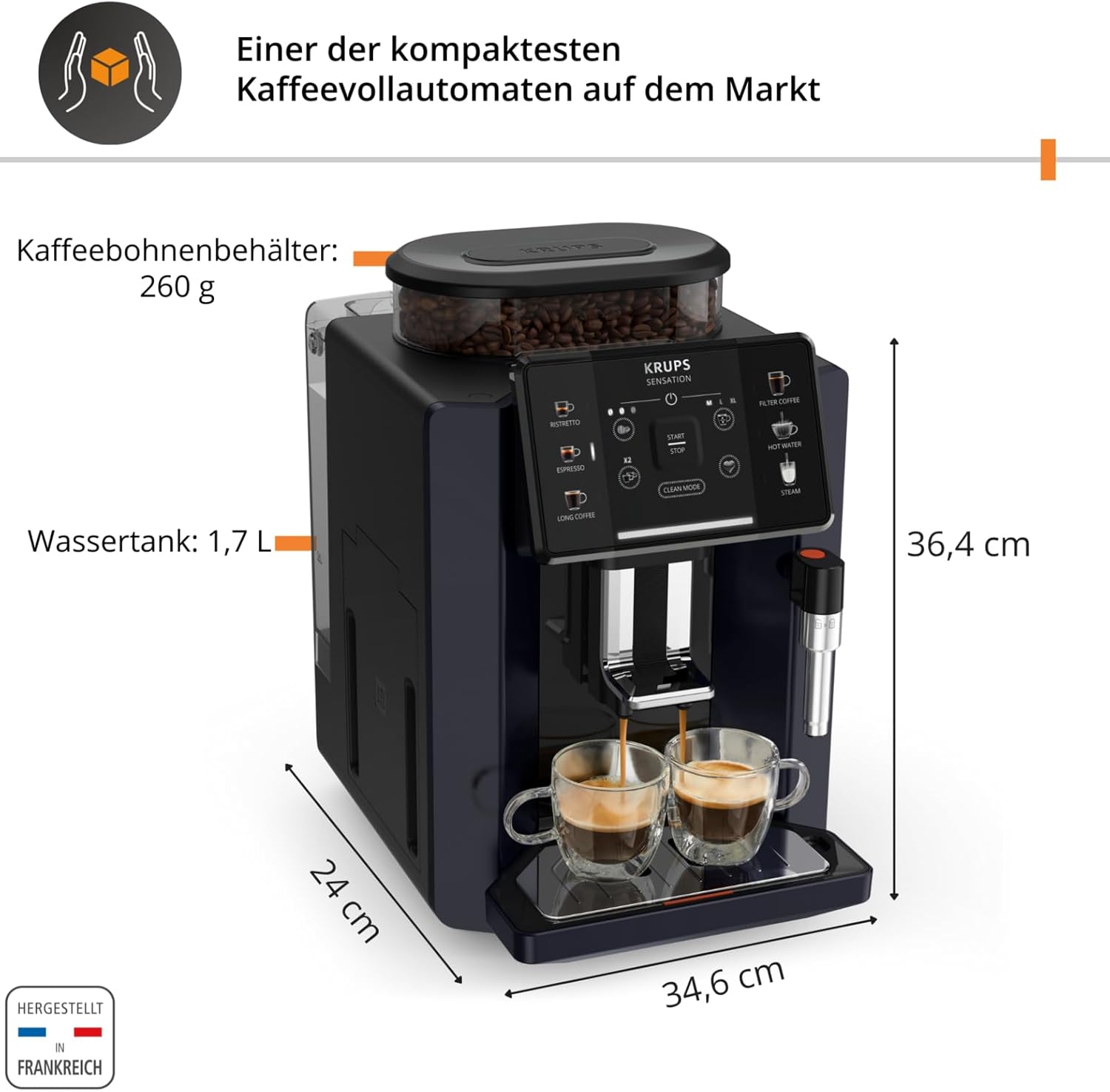 Besondere Eigenschaften Automatische Reinigung, Brühgruppe aus Metall, Filterkaffee-Funktion, Milchaufschäumer, Sensor-Touch Bedienfeld